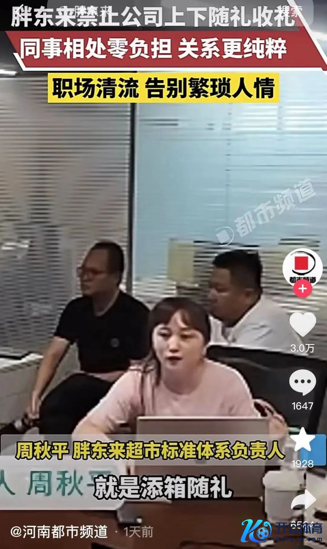 9月24日,“胖东来辞让公司潦倒随礼”冲上微博热搜第一。据报谈,近期在联商网组织的一次国内零卖企业里面东谈主力资源辩论会上,胖东来代表先容了公司的一项文化轨制,即职工家有红白大事时,不允许共事间“添箱随礼”,该公司有关部门会向有家事的职工披发贺金或慰问金。记者随后向胖东来公司进行求证,后者阐述属实。