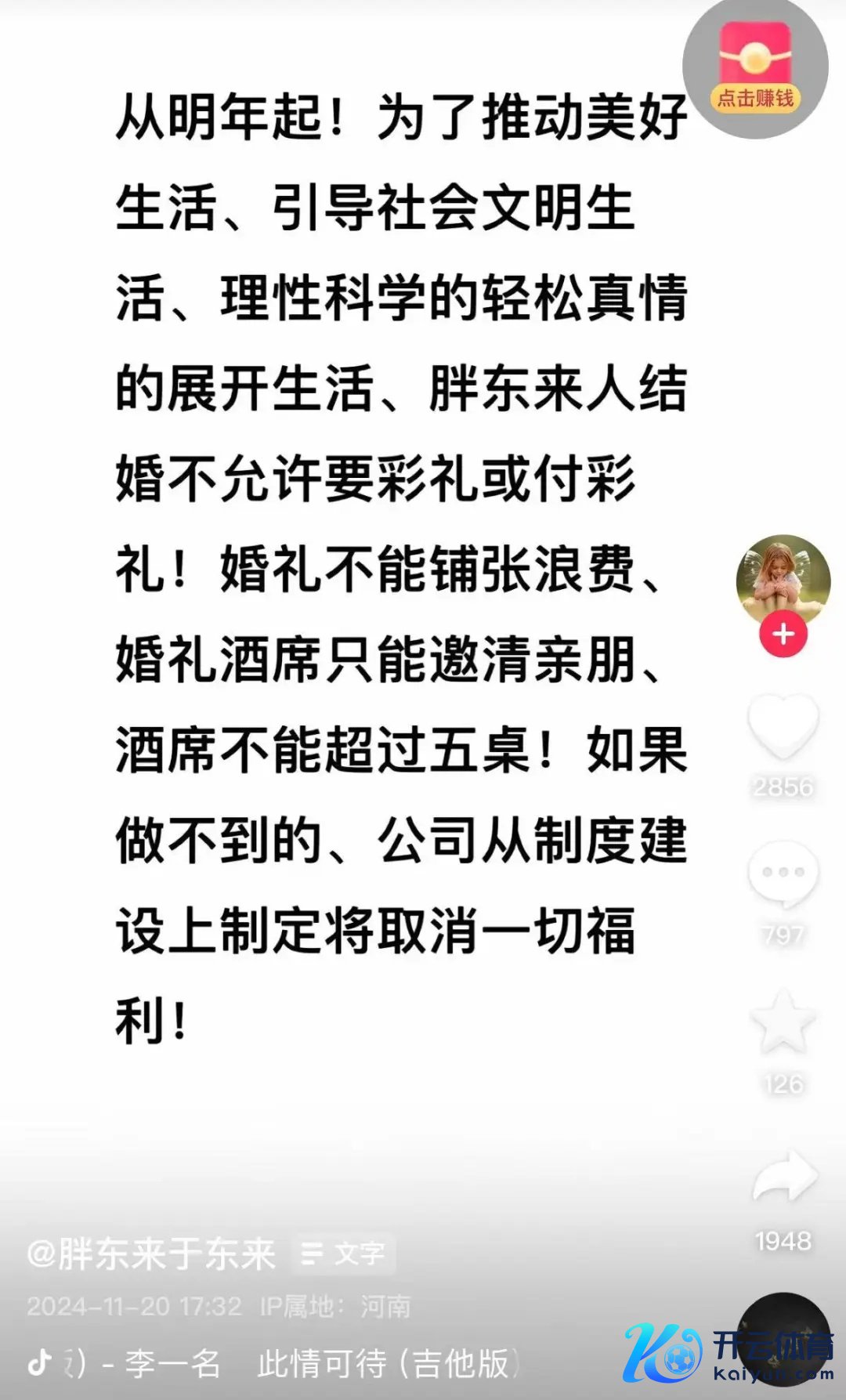 11月20日,胖东来独创东谈主于东来在其个东谈主抖音账号邻接发布4条笔墨动态,声称从来岁起,为了推进好意思好生计、相似社会端淑生计,胖东来东谈主成婚不允许要彩礼或付彩礼,婚典不可淘气糜费,酒菜不可卓越五桌,不允许靠父母买房买车。如若作念不到的开云官网登录入口,公司将从轨制开辟上制定取消一切福利。