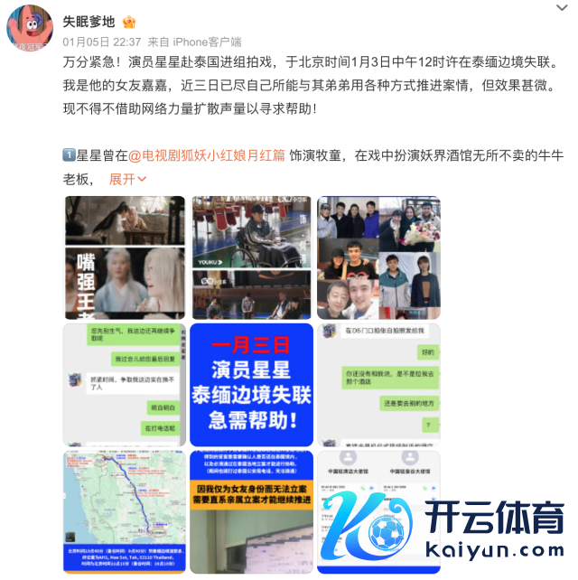 1月5日晚,微博用户@失眠爹地 发文,称其男友“星星”(真名王星)日前赴泰国责任,于北京时分1月3日中午12时许在泰缅边境失联,距离终末一次发音信一经进取60个小时,其已朝上海警方报警。 事件发生后,舒淇、姚晨、龚俊等多位演员转发了“星星失联”的信息,激勉网友关心,话题#演员星星在泰缅边境失联#冲上网罗热搜榜。 据悉,演员王星曾在多部电视剧中出演,包括《玫瑰的故事》《猎罪图鉴》《女表情师》等。@失眠爹地 暗示,王星在看到有剧组招聘演员的信息后添加了统筹东说念主员的关联模式,在通过试戏后被安排去