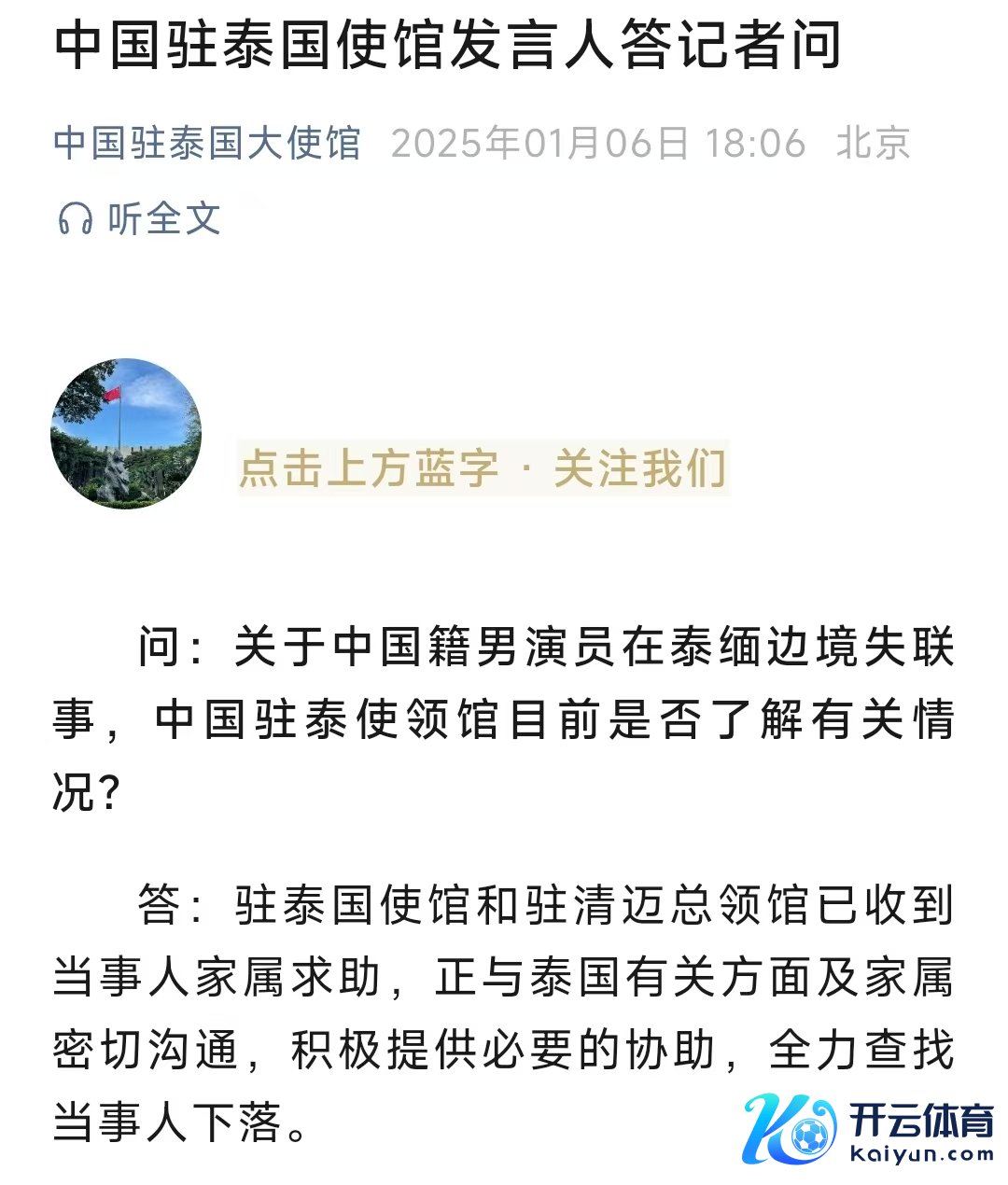 1月6日,中国驻泰国大使馆官微发文称,驻泰国使馆和驻清迈总领馆已收到当事东说念主家属乞助,正与泰国关联方面及家属密切疏导,积极提供必要的协助,全力查找当事东说念主下跌。