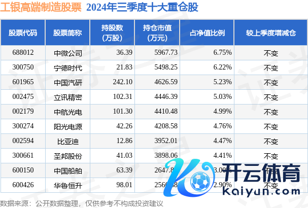 工银高端制造股票为股票型基金,字据最新一期基金季报显现,该基金金钱竖立:股票占净值比92.44%,无债券类金钱,现款占净值比7.35%。基金十大重仓股如下: