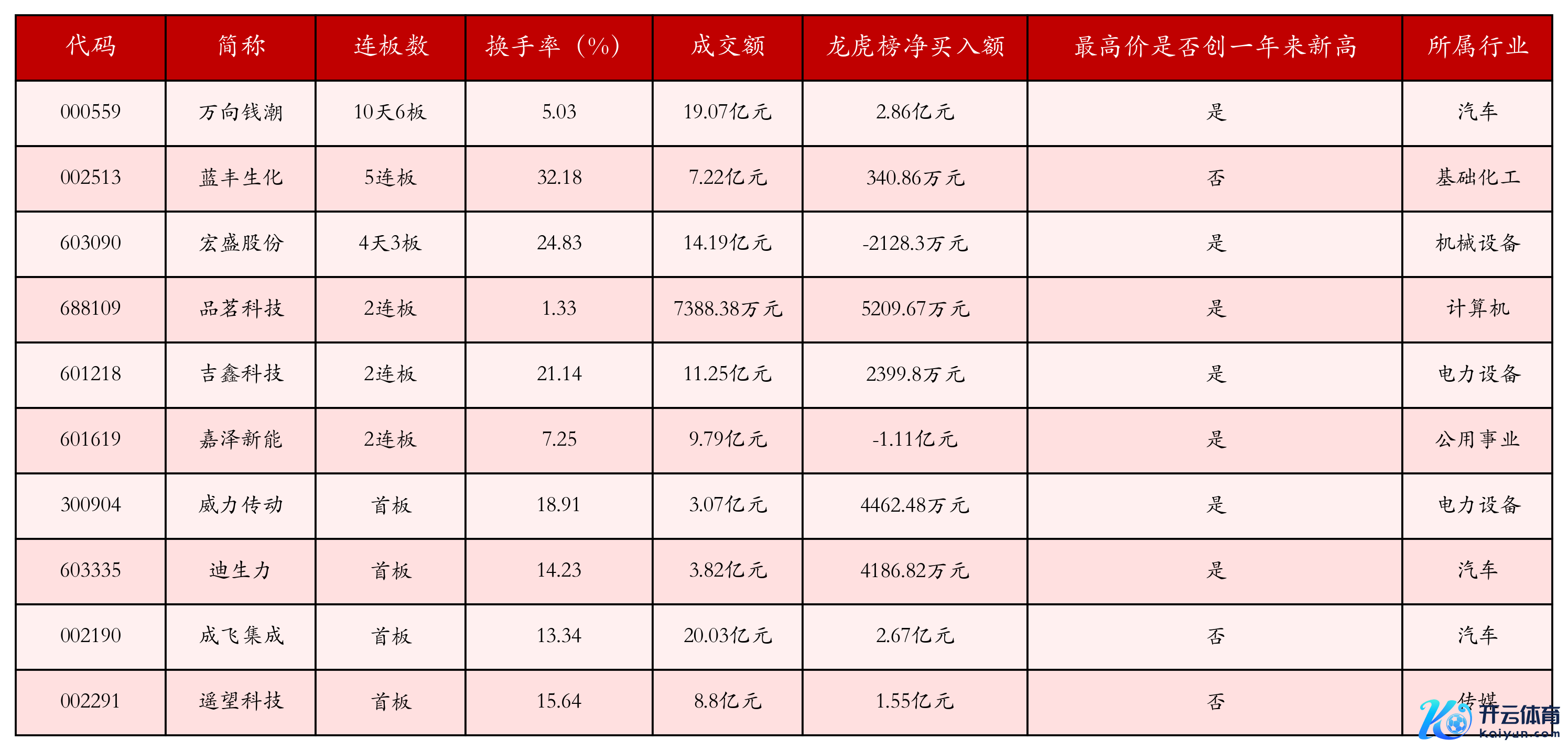 一、强势个股为止9月26日收盘,上证综指下落0.65%,收于3828.11点,深证成指下落1.76%,收于13209.0点,创业板指下落2.6%,收于3151.53点。本日沪深两市A股联想58只涨停,详尽现时连板数以及当日龙虎榜数据,其中较为强势的前三只个股划分为:万向钱潮(000559)、蓝丰生化(002513)与宏盛股份(603090)。本日强势个股前10位具体数据见下表: