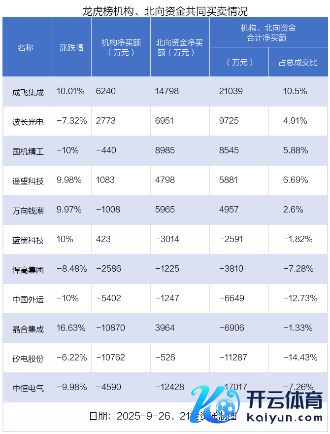 值得闪耀的是,机构和北向资金共同净买入了成飞集成、波长光电、眺望科技等3股;共同净卖出了矽电股份、悍高集团、中海外运、中恒电气等4股;在国机精工、万向钱潮、晶书册成、蓝黛科技上出现不对,机构净卖出洋机精工440.14万元,北向资金净买入8984.8万元;机构净卖出万向钱潮1008.06万元,北向资金净买入5964.89万元;机构净卖出晶书册成1.09亿元,北向资金净买入3963.97万元;机构净买入蓝黛科技422.55万元,北向资金净卖出3013.66万元。